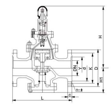 Y43H先导活塞式蒸汽减压阀本系列减压阀属于先导活塞式减压阀。由主阀和导阀两部分组成。主阀主要由阀座、主阀盘、活塞、弹簧等零件组成。导阀主要由阀座、阀瓣、膜片、弹簧、调节弹簧等零件组成。通过调节调节弹簧压力设定出口压力、利用膜片传感出口压力变化,通过导阀启闭驱动活塞调节主阀节流部位过流面积的大小,实现减压稳压功能。