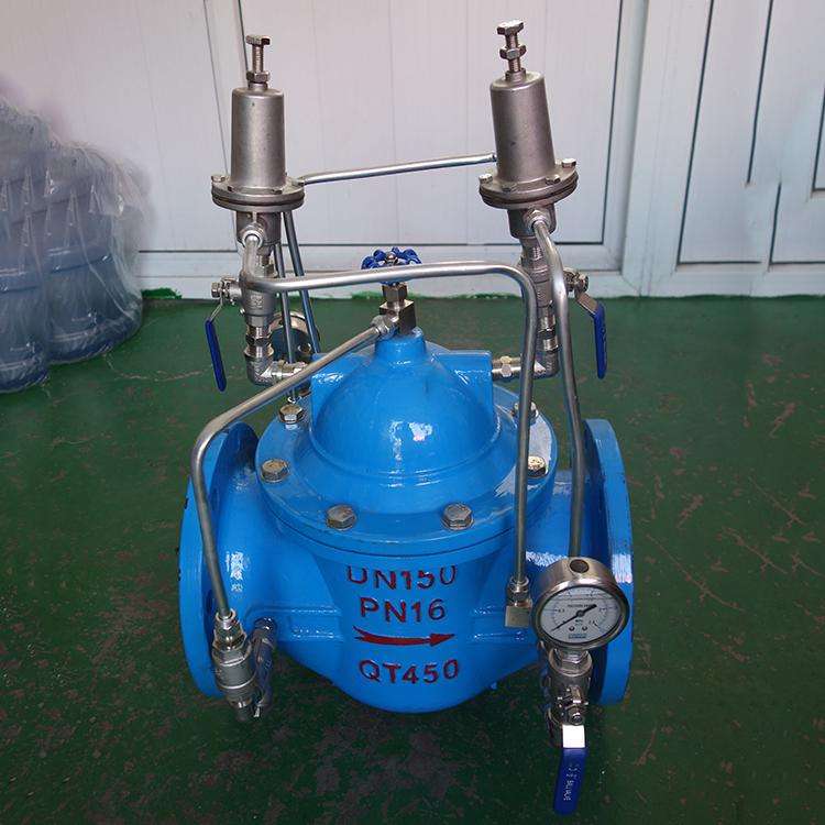 遇到突然的停泵,水流会因为惯性作用让水柱产生分离,从而下降系统压力,然后分离的水柱在合在一起。两股分离的水流因为剧烈碰撞会产生很高的合并水锤,之前会有很大的压力波动,压力波动预止阀的低压泄压导阀可最先感应到期初的这种压力下降,之后会先开启主阀,紧随其后来的水流高压使主阀打开,泄放系统压力会升高,使用了压力波动预止阀就会防止产生水锤现象。压导阀感应到压力升高,也会开启主阀,并且让主阀保持开启状态,液压或机械的流量控制器会限制阀门的开启,压力波动预止阀能有效的控制压力波动,并让主阀能及时的关闭不用额外再损失系统压力,当系统的高压降低至设定值时,高泄压导阀就会关闭,主阀也会随之关闭,当主阀关闭,系统的压力会恢复到正常情况。高压、低压泄压导阀上面装的都有调节螺丝,可以分别设定高低压泄压值,由针阀控制主阀的关闭速度。