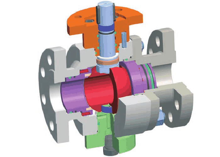 二、固定球球阀 球阀的球体是固定的,受压后不产生移动。固定球球阀都带有浮动阀座,受介质压力后,阀座产生移动,使密封圈紧压在球体上,以保证密封。通常在与球体的上、下轴上装有轴承,操作扭距小,适用于高压和大口径的阀门。 为了减少球阀的操作扭矩和增加密封的可靠程度,近年来又出现了油封球阀,既在密封面间压注特制的润滑油,以形成一层油膜,即增强了密封性,又减少了操作扭矩,更适用高压大口径的球阀。