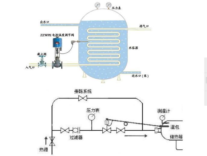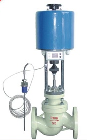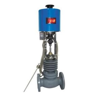 电控温度调节阀由控制阀门、电动执行机构、温度传感器和温度调节器等部件组成,根据用户需要,分别有加热型与冷却型两种结构。加热型调节阀的结构与原理:工作前主阀芯处于半开位置,传感器处于自然状态。接上电源,主阀芯全开。介质由箭头方向流入主阀体、经阀芯对储热箱进行加热。当温度升到相应设定值时,传感器即产生相应线性信号输入一体化执行机构,随即驱动阀杆、阀芯产生位移,关闭主阀芯停止加热。当温度低于设定值时,传感器即产生线性信号输入一体化执行机构,驱使阀芯渐开,使介质按抛物线特性流入储热箱,进行加热直至设定值。这样被控介质始终在设定温度范围内被控制,从而达到控温目的。备注:常说的加热型、冷却型。在此阀中只要更换阀芯结构即可以实现。