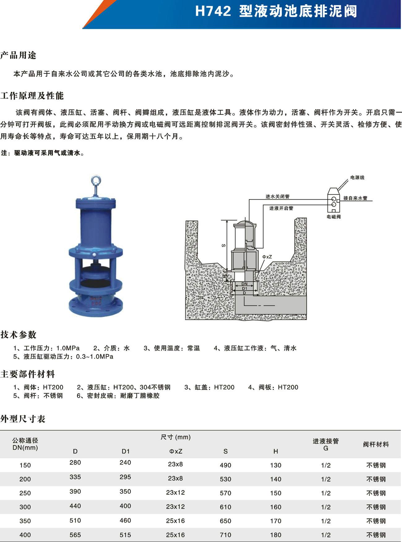 H742X液动池底排泥阀设计结构新颖,总重比常规同类产品轻,安装、维修不需使用吊装工具,而维修只需一人就可胜任。经众多自来水厂使用,用户一致认为:使用本阀前反应絮凝池积泥严重,穿孔排泥管时有堵塞,严重影响了水处理效果,且每年需定期空池人工清洗;使用本阀后,反应絮凝池没有明显的积泥现象,不需每年空池人工定期清洗,水质也得到明显的改善,而且本阀整体设计合理,安装和维护方便,经久耐用。尤其采用了微机自动控制系统的单位,不但能大大减轻操作人员的劳动强度和提高水厂的自动化水平,而且提供了对水质不同时期沉淀污泥沉降曲线测定的有效手段 ,从而为实现污泥的量化排放找到了直观合理的排泥周期,排泥效率显著提高,克服了手动开阀慢、排泥泥水含泥率低、泥水浓度不一造成的水浪费等不利因素,对水厂的节能和提高供水质量提供了较为理想的产品。