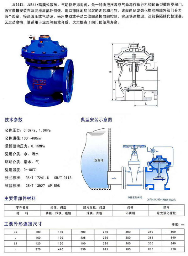 排泥阀主要安装在各类污水池体外,用以排除池底的泥沙及污物。膜片式快开排泥阀主要性能特点: