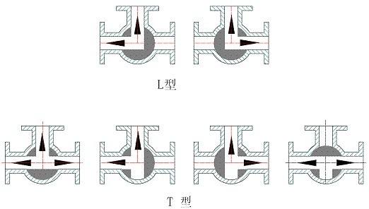 三通球阀有T型和L型。T型能使三条正交的管道相互联通和切断第三条通道,起分流、合流作用。L型三通球阀型只能连接相互正交的两条管道,不能同时保持第三条管道的相互连通,只起分配作用。