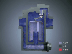 1、当设备刚启动时,管道内出现空气和冷凝水,此时倒吊桶下沉,连杆带动阀芯打开阀口,空气和冷凝水迅速排出,实现快速气动。 |