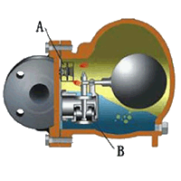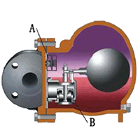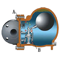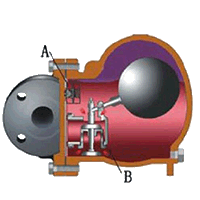 2、当冷凝水进入疏水阀时,空气从阀口(A)排出,杠杆浮球随冷凝水液位上升,双阀座设计能使冷凝水从阀口(B)迅速排出。 |