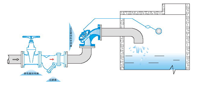 当水池或水箱内水位下降,浮球阀开启排水时,进水管内有压水将阀内活塞托起,密封面打开,阀门即开启供水。当水位上升到控制线时,浮球阀关闭.活塞下移将密封面钓闭,闭门停止供水。