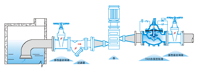 700X消防水泵控制阀是一种安装在水泵出口处,防止介质倒流的逆止类阀门。当水泵即将停止供水前,阀门先行缓慢关闭90%左右,防止突然停泵而产生的水锤和水击声,当水泵完全停止后,阀门在完全关闭,防止泵出的水回流,有效地保护水泵,免受回流的冲击而产生反转。该产品是水泵出口必不可少的保护装置。阀门呈流线型设计,通过电磁阀的导控实现准确的启闭,使用安全可靠,有效地防止水锤和水击声,使用寿命长,安装,维修方便。