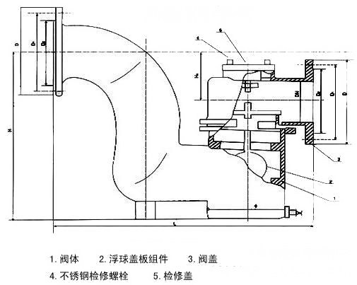 F43X防逆水封阀主要由带存水弯的阀体及浮球盖板组件等组成,带浮球的盖板盖在阀体的密封阀座上,将阀腔分成内外两部分,内腔为清水部分,外腔通排水管道,当内腔充满清水时,因位于内腔的浮球作用,盖板压力降低,易于开启通流。溢流停止后,盖板可白行复位.盖严阀座,从而可严格阻断臭气及污水倒灌。如果水池进水口浮球阀关闭良好,数年不溢流,阀腔无水,浮球可加重盖板重量,更好地盖严阀座,同样可严格阻隔臭气及防止雨、污水倒灌清水池。如果污水进入阀体外腔,所带杂物仅能粘附在盖板外表面,不影响盖板封严阀座。故该防逆水封阀工作可靠,效果好,不易出故障。且当有杂物沉淀时.下次溢流时可自动冲出阀体。