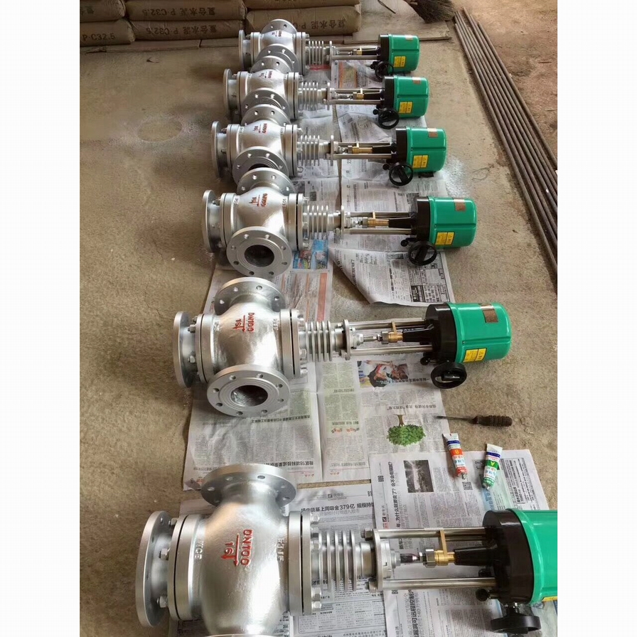 三通调节阀阀芯结构为圆筒型薄壁窗口形阀芯,采用阀芯侧面导向与阀座内表面导向和上衬套导向,因此导向面积大,工作可靠。流体对阀芯作用方向都处于流开状态,故阀工作性能稳定。三通调节阀有三通合流式调节阀(把两种流体经三通阀混合成一种流体)和三通分流式调节阀(把一种流体经三通阀分成两路流出)两种形式。当公称通径DN≤80mm和压差较小的场合时,分流阀可以采用同口径的合流阀代替。流量特性有直线性、抛物线性两种。三通调节阀它可以代替二台同时使用的二通调节阀,起分流或合流作用及两相调节配比作用。