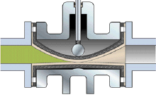 7、球形,指阀体外壳形状。在采用用控制介质注入阀体外壳与套管之间,挤压套管实现夹断的方式时,采用球形外壳有利于套管在介质压力下回到完全打开状态。